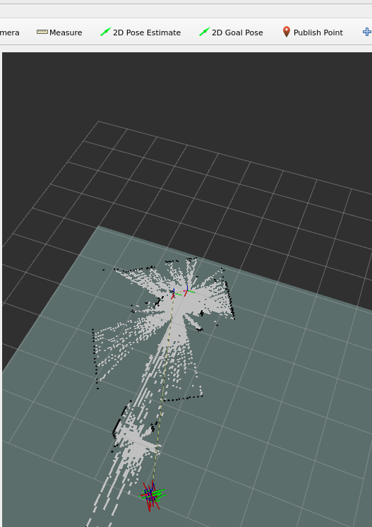 in the 2 photos below you can see at the first image the start location, where the robot started. Then i drove the robot a bit but as you can notice the map does not update, since the TF updates but map not. Before the map could not update at all. But after i changed the mod of the Lidar to “Standard” i got this. But still messy. I should mention here that the LIdar works very fine and deliver the data very good.