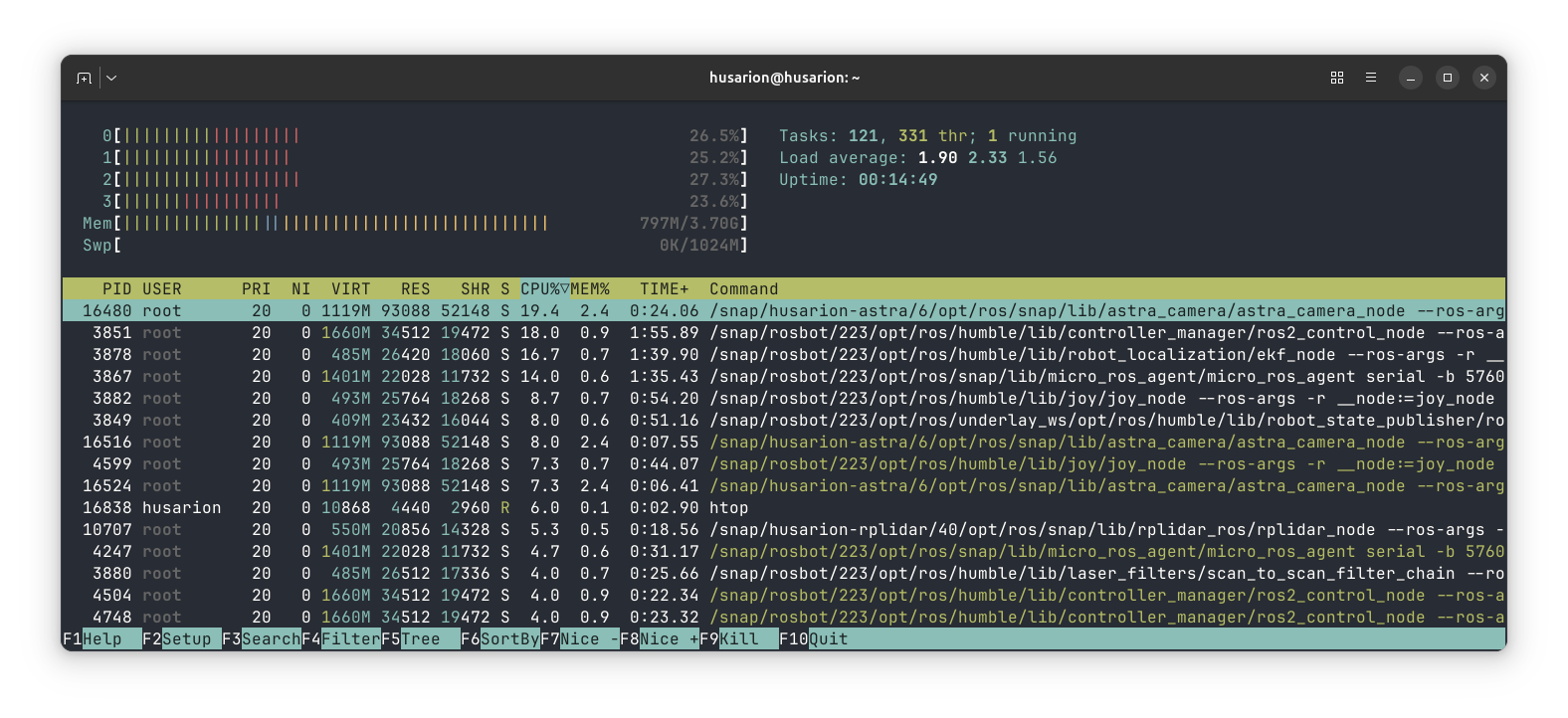 The ROSbot 2R snap-based configuration (rosbot, husarion-astra, husarion-rplidar)* hovers around 30% CPU utilization. Reviewing the history, I see that the camera service is called astra. Therefore, I suspect that in your case, we’re dealing with a different driver or a different camera.