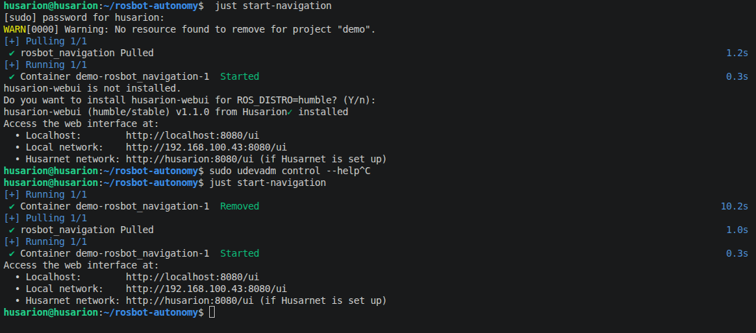 When starting the just start-navigation I would always get this prompt: sudo: husarion-webui.start: command not found. Then I remembered that in order to perform sudo rosbot.stop or sudo rosbot.start I had to add /snap/bin for it to work. I went with this clue and changed the just file to: sudo /snap/bin/husarion-webui.start sudo /snap/bin/husarion-webui.stop. Then just start-navigation worked. Do you think it’s a problem with my environment?